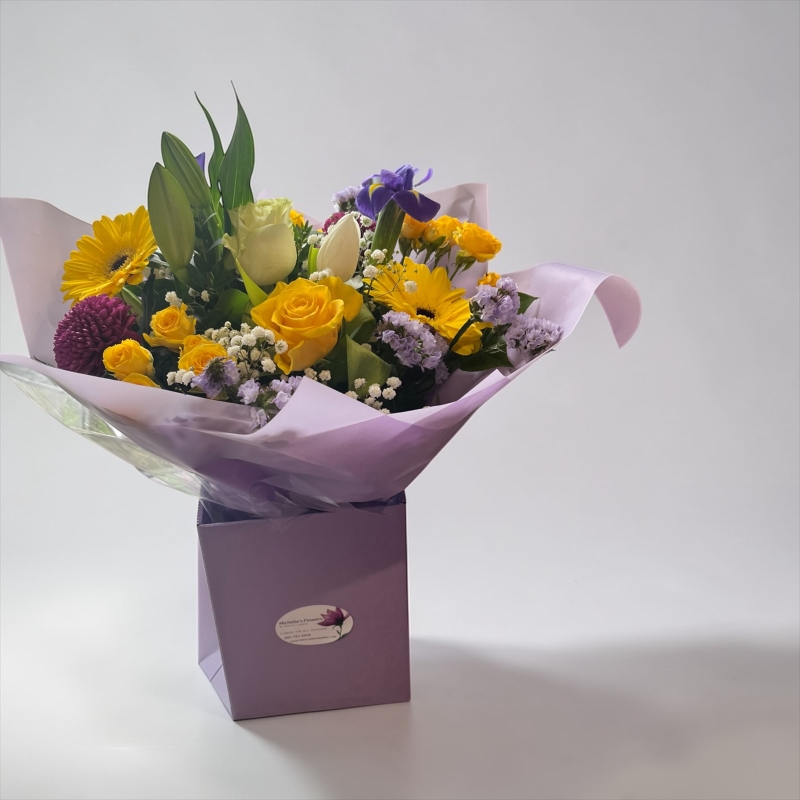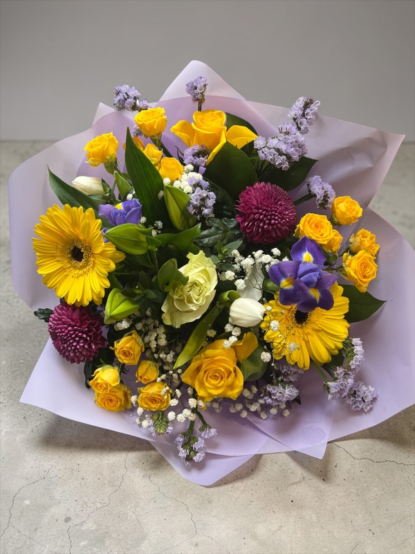 A delightful Bouquet featuring lush Roses vibrant Gerberas and delicate Carnations, complemented by fresh blooms and greenery. This classic beauty of Roses symbolise Love and Admiration, while Gerberas add a cheerful touch, soft ruffled carnations bring warmth and charm, making this arrangement a perfect expression of admiration and joy